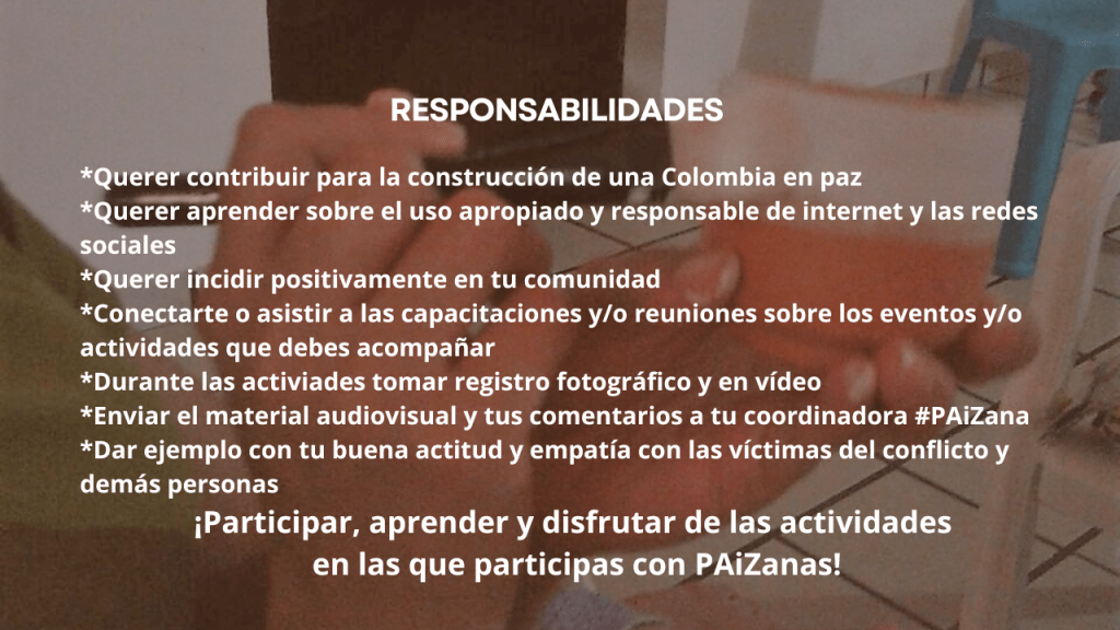 Finalmente en el 2023, en aras de involucrar jóvenes para hacer un voluntariado en activismo social digital con el fin de generar impactos positivos y tangibles en sus comunidades (en todo el territorio nacional), acogiendo la idea del profe Jarold y aprovechando que en el marco de la 1 jornada de la #LaEducaciónAbrazaLaPaz de ese año, denominada #LaEducaciónAbrazaLaVerdad, pudimos ‘probar este experimento’ gracias a la buena voluntad de nuestra ‘Embajadora’ pionera Sarita Ortega, y dado que el resultado fue absolutamente satisfactorio, tanto para nuestra primera embajadora PAiZana, como para nosotras, tomamos la decisión de lanzar este voluntariado que se enfoca en nuestros cuatro pilares fundamentales: #ConstrucciónDePaz, #Educación, #EmpoderamientoFemenino y ApropiaciónTIC.