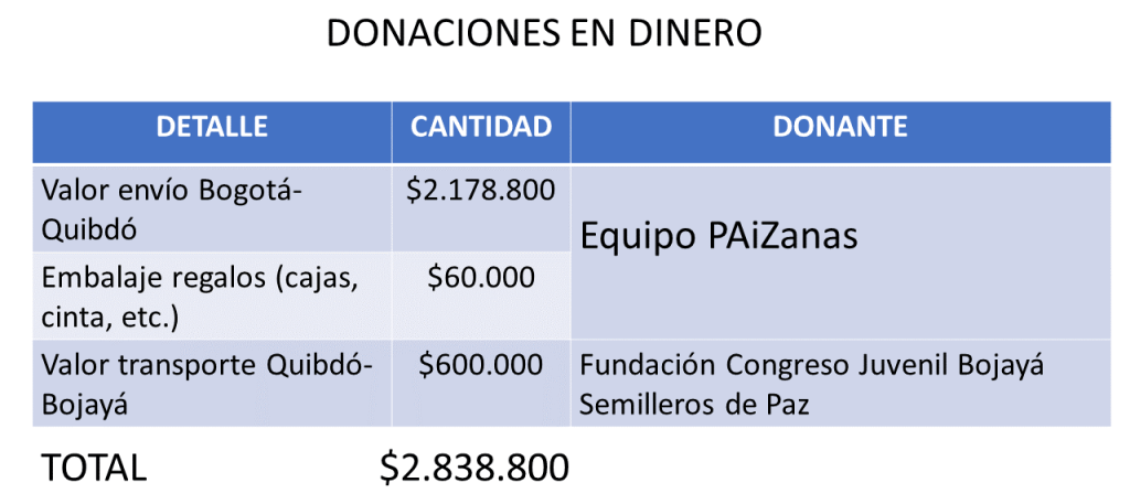 Enviamos 20 cajas, con un valor promedio de envío por caja de $109.000, para un total de $2’178.000 y el costo del embalaje fue de $60.000, donado por el equipo de PAiZanas. Las cajas llegaron a Quibdó el 31 de enero, en donde las estaba esperando nuestro aliado en el territorio el profesor Leonel Blandón, director de la Fundación Congreso Juvenil Bojayá Semilleros de Paz.