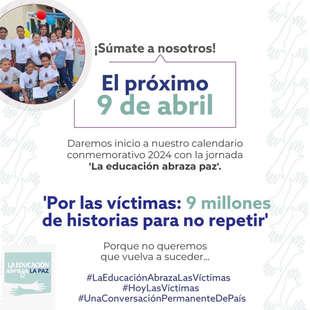 El próximo 9 de abril se realizará la primera jornada del calendario conmemorativo ‘La Educación Abraza La Paz’, fecha en la cual se evoca el ‘Día de la memoria y solidaridad con las víctimas del conflicto armado en Colombia’.