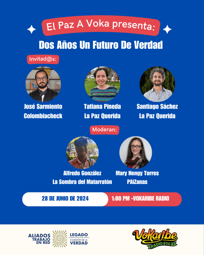 Para conocer más actividades en el marco de los dos años de la entrega del Informe Final de la Comisión de la Verdad, visita seremos.co, plataforma social y virtual para el encuentro de organizaciones que promueven acciones de movilización al rededor del Legado de la Comisión de la Verdad, y la implementación de sus Recomendaciones.
